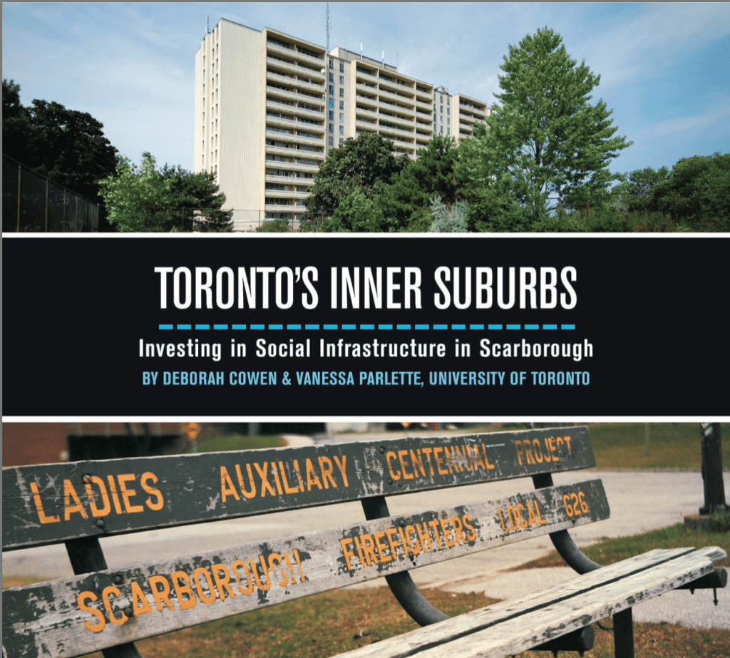 Cowen, Deborah and Vanessa Parlette (2011) Inner Suburbs at Stake: Social Infrastructure in East Scarborough. Report prepared for the Cities Centre. 33,700 words.Companion report for public circulation entitled “Toronto’s Inner Suburbs: Investing in Social Infrastructure in Scarborough.” Available at http://www.citiescentre.utoronto.ca/Assets/Cities+Centre+Digital+Assets/pdfs/publications/Cowen+Torontos+Inner+Suburbs+2011.pdf