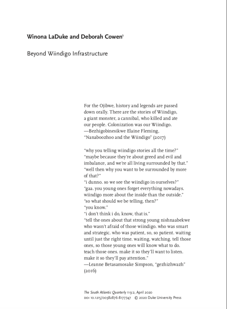 LaDuke, Winona & Deborah Cowen (2020) “Beyond Wiindigo Infrastructure.” South Atlantic Quarterly. 119(2): 243-269.