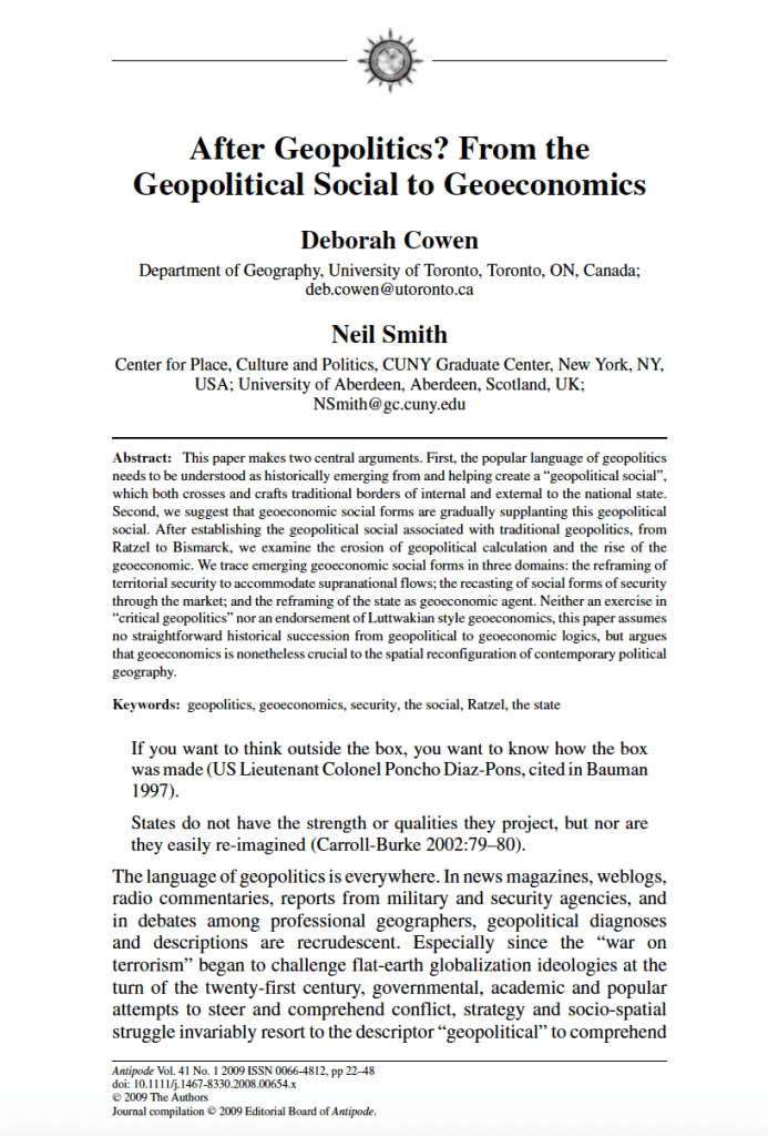 Cowen, Deborah and Smith, Neil (2009) “After Geopolitics? From the Geopolitical Social to Geoeconomics.” Antipode. 41(1): 22-48. Republished in Geopolitics: An Introductory Reader, Jason Dittmer & Jo Sharpe (eds.). Taylor & Francis.