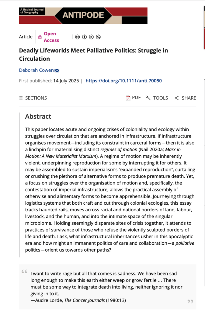 Cowen, D. (2025) “Deadly Lifeworlds meet Paillative Politics: Struggle in Circulation. Antipode, July (early view).