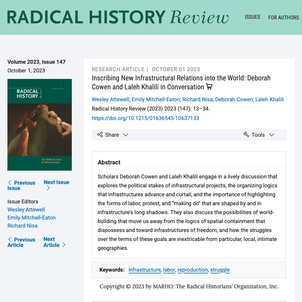 Cowen D. & Khalili, L. (2023) “Inscribing New Infrastructural Relations into the World.” Radical History Review.